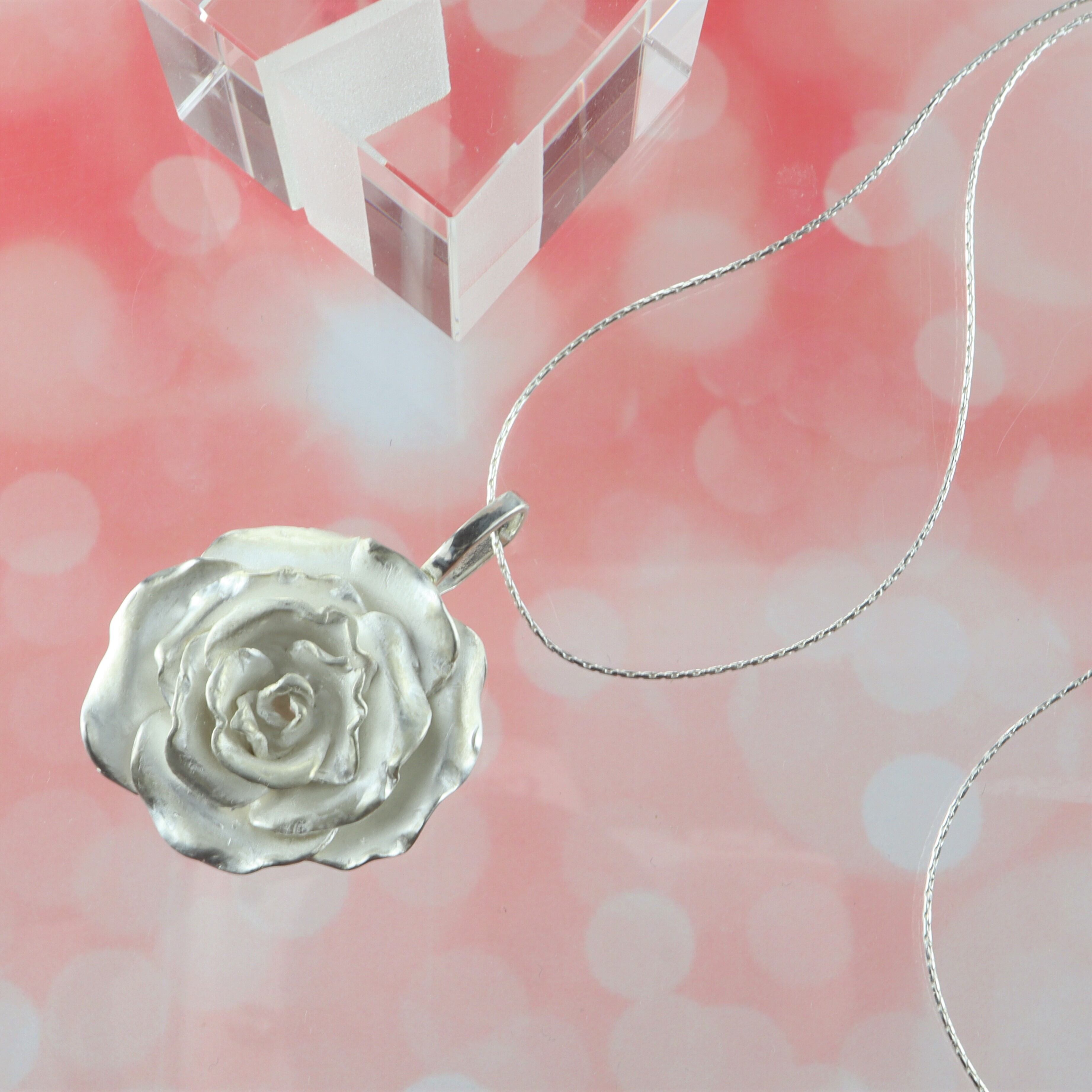 花弁一枚一枚に特徴をつけたリアルな造形、一点ものです。銀肌は柔らかなつやの白仕上げのペンダントトップです。